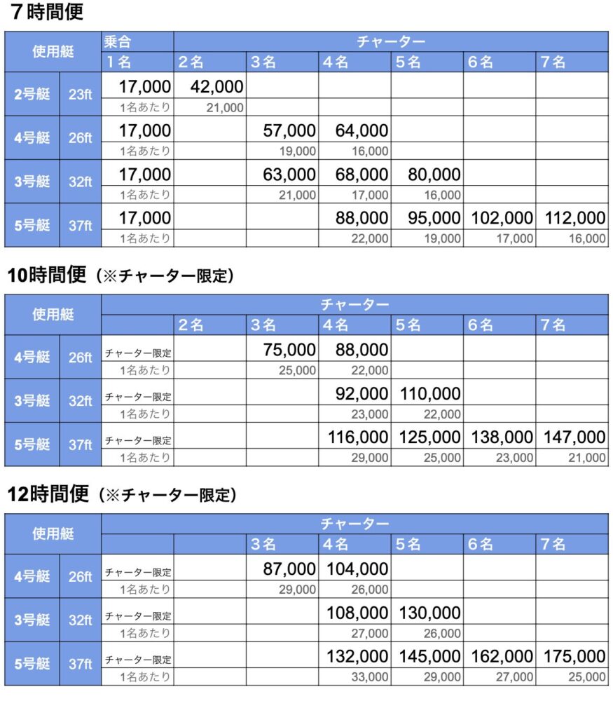 ※ 使用艇のご指定がない場合は、人数や釣り物などを考慮の上こちらで決めさせていただきます。