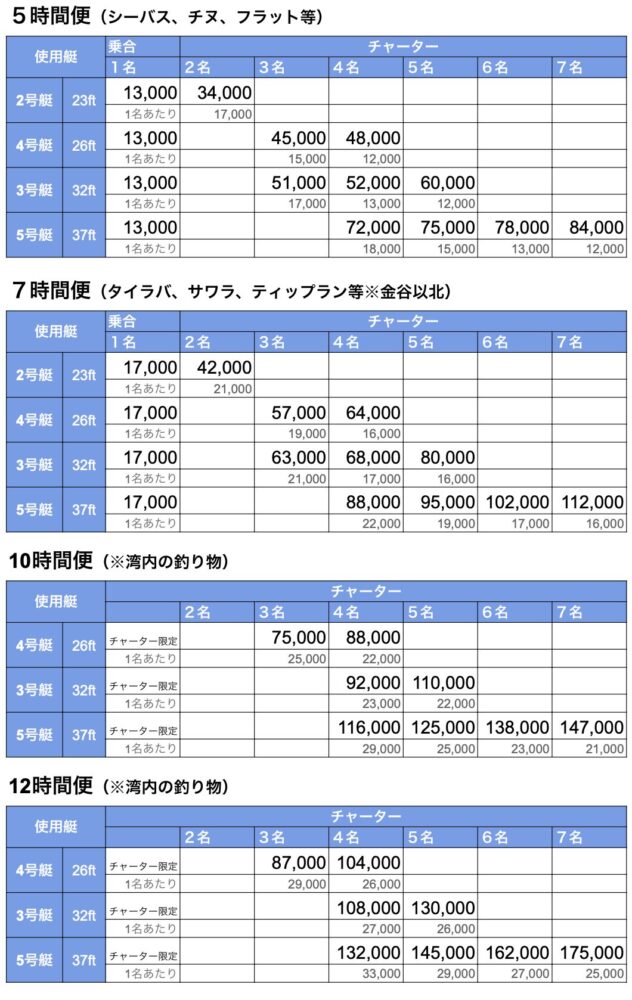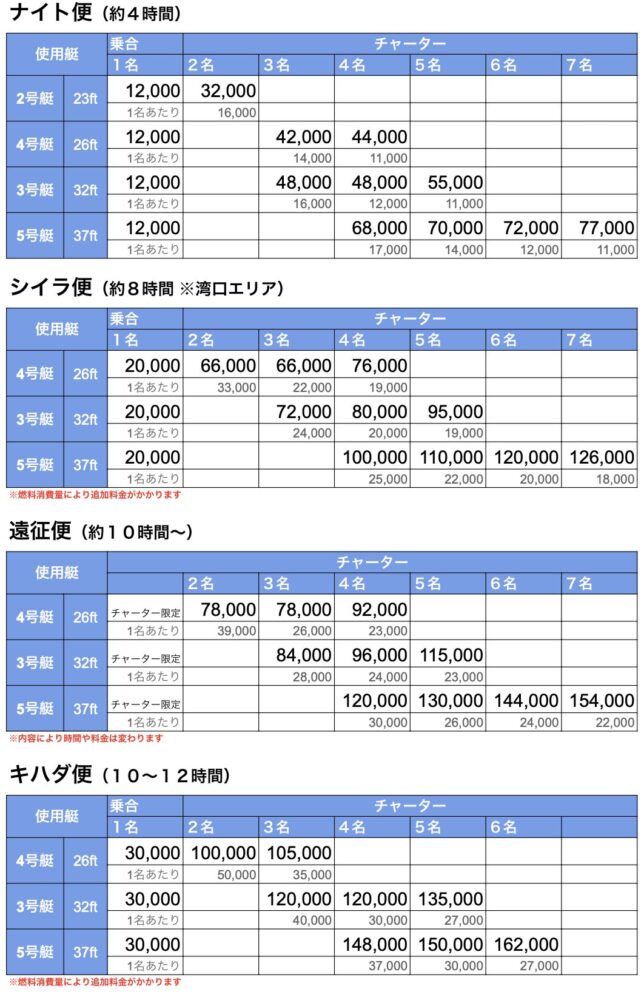 - 海況により遠征出来ない場合、相談の上で近場の釣り物への変更も承ります。また台風・天候悪化等で危険と判断した場合は出船中止となりますので、ご理解をお願いします。